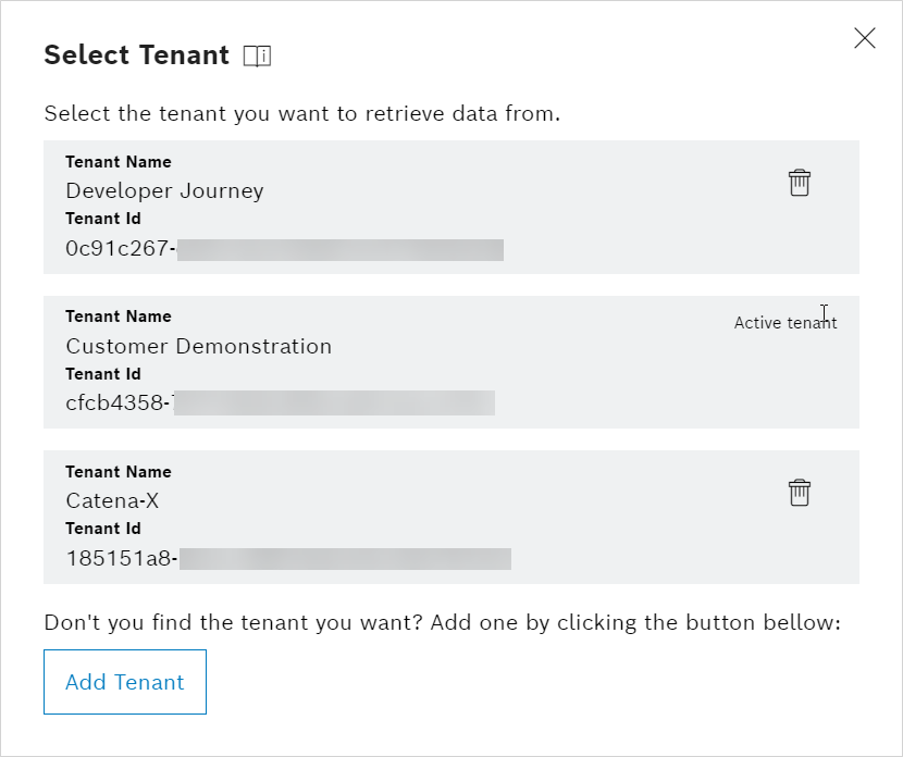 The Aspect Model Catalog enables you to have all your tenants listed, so that you can easily choose and switch between them. You can also add new ones. Additionally, if you do not include your tenant ID in the URL when opening the Aspect Model Catalog, the Select Tenant dialog will pop up, displaying all tenants, which you have accessed.