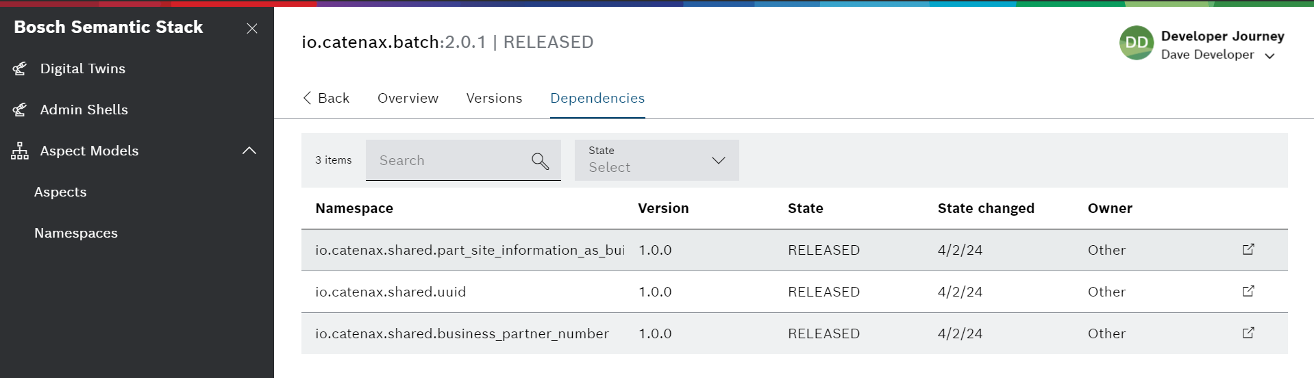 As shown above, dependancies are also displayed in the folder structure of a namespace. A dependency is a namespace that is dependent on the main namespace, containing references to it. You can look up dependencies in the Aspect Model Catalog UI in the Details Page of a namespace.