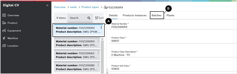 → The tab with the batches will also be available when they drill down to deeper sub-levels of the parts hierarchy. The batches that appear in the tab is the list of batches of parts installed in this part.